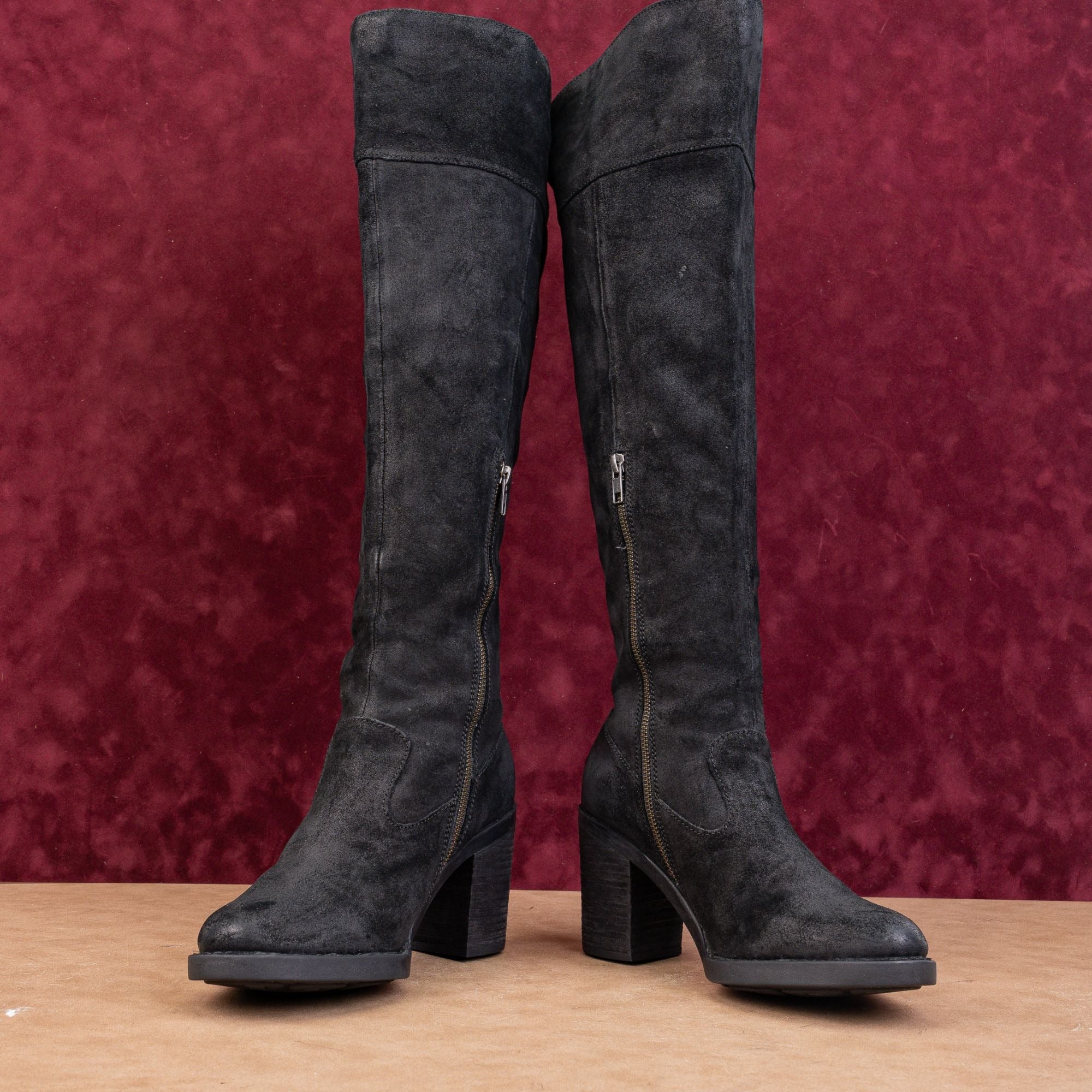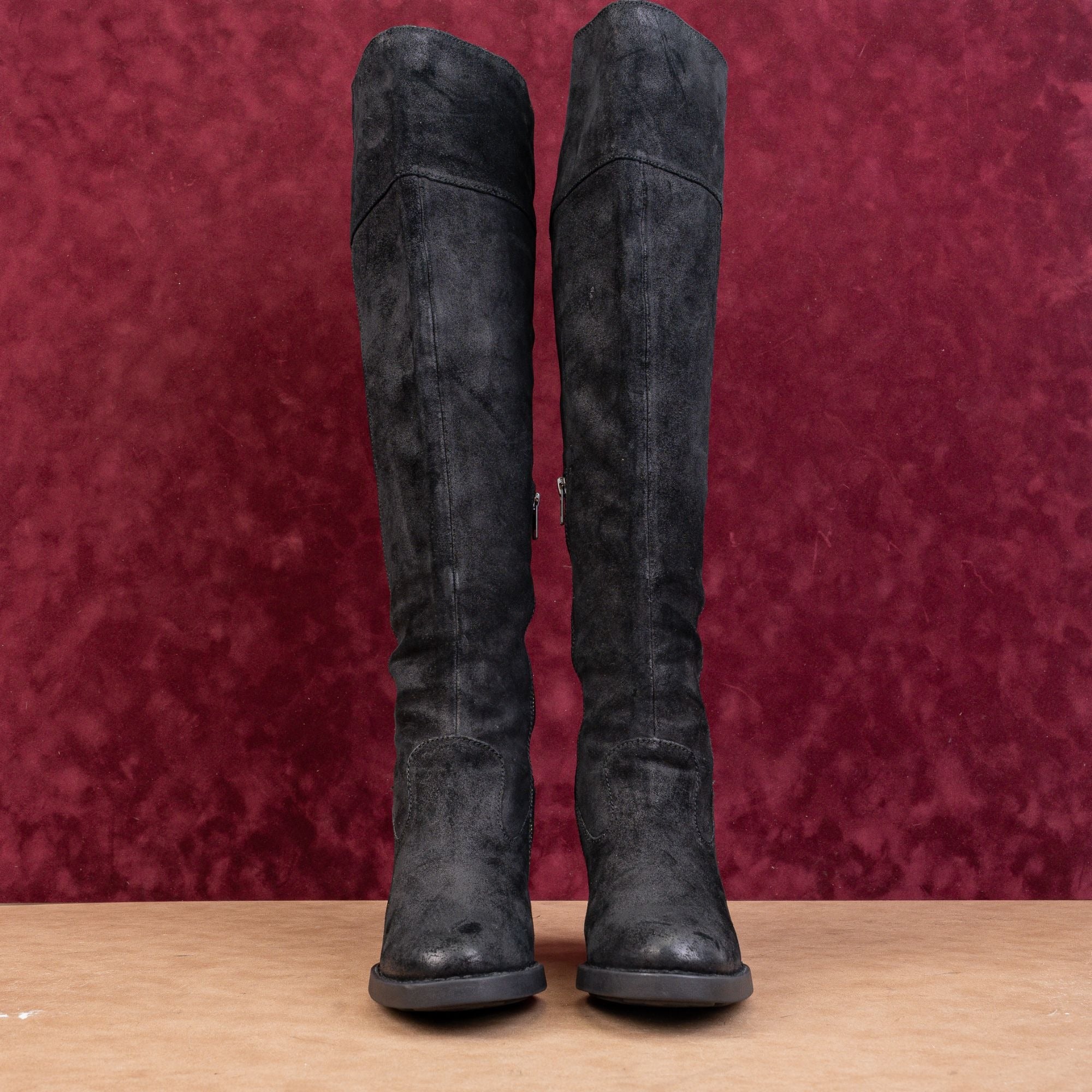 Combining artisanal craftsmanship with a modern silhouette, these boots are crafted from premium, velvety black suede with a factory-distressed finish for an authentic, lived-in look.