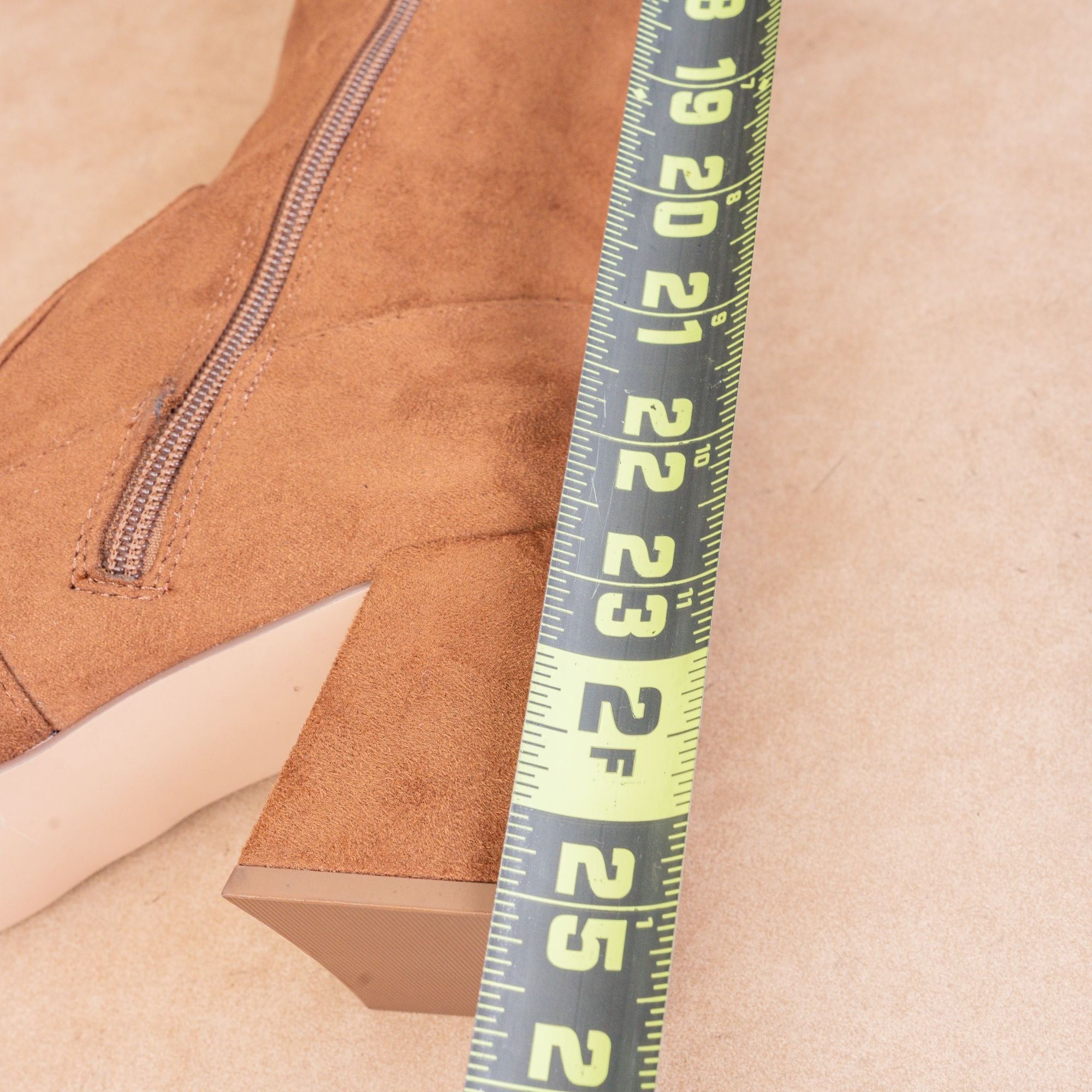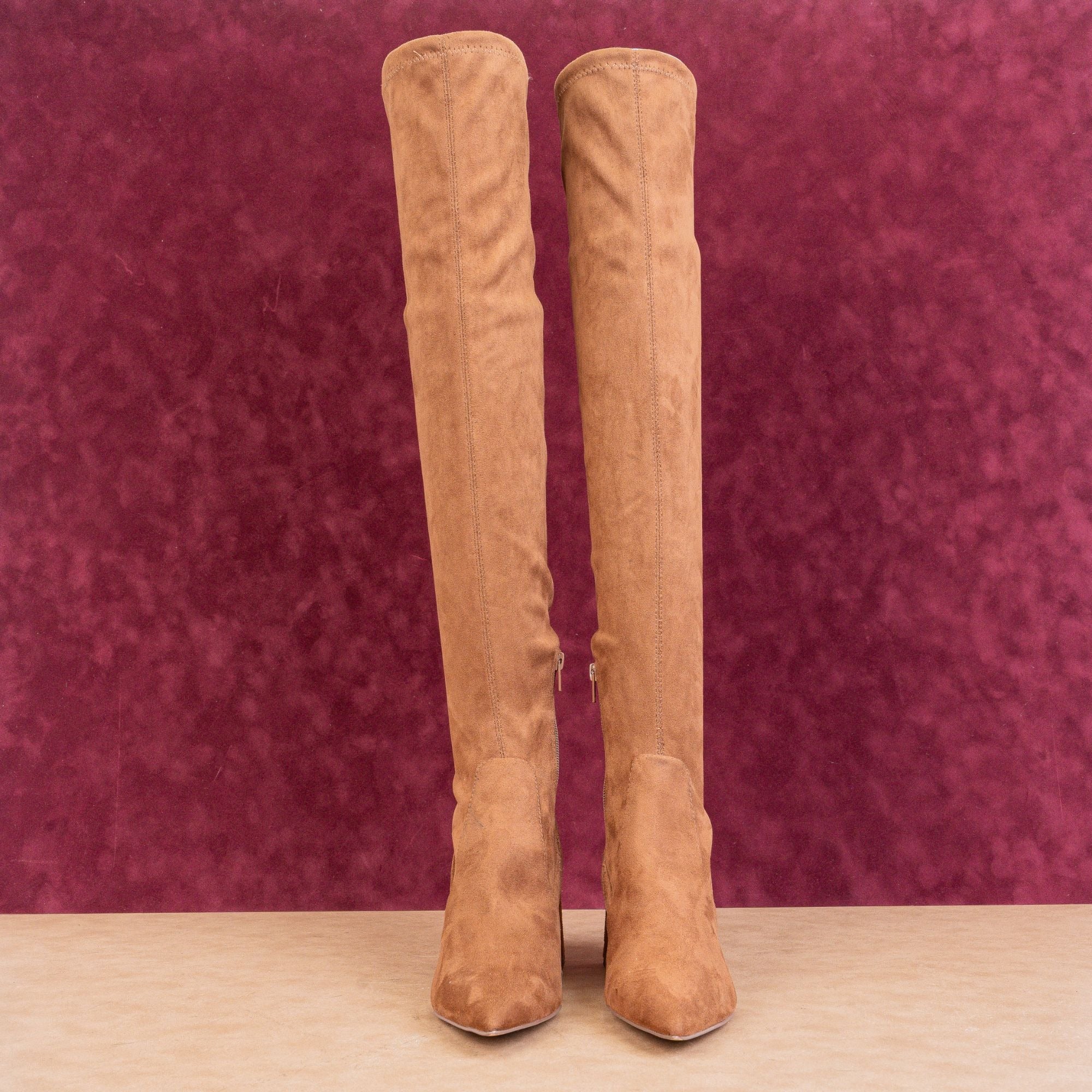 They're crafted from a chic, brown stretch fabric that creates a flawless, second-skin fit all the way up your leg.