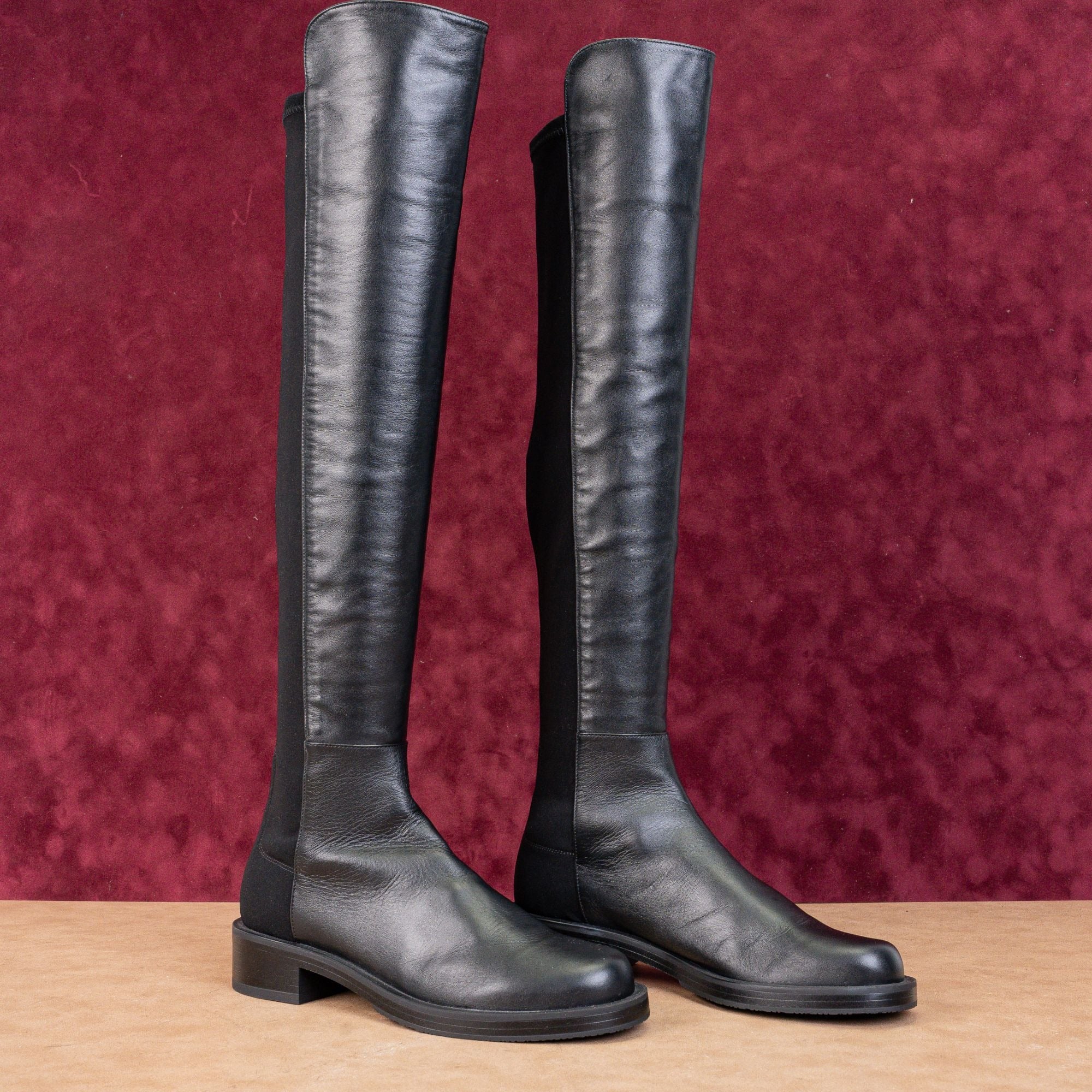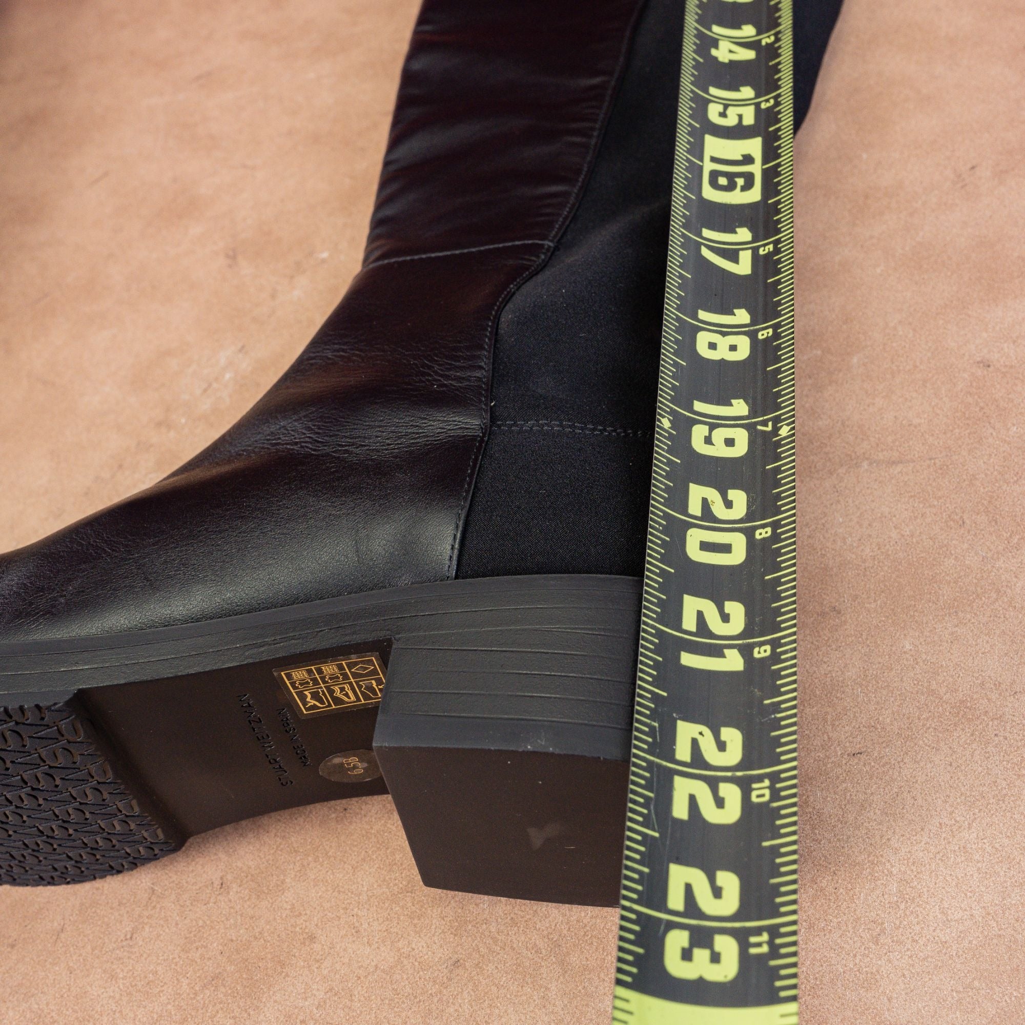 Crafted in Spain, it features the signature half-and-half design: luxe black Nappa leather in the front, and a flawless-fitting stretch microfiber back. The low, walkable block heel makes it the most comfortable and versatile OTK boot you will ever own.