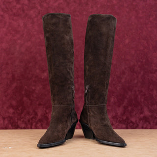 AGL Women Dark Brown Suede Western Cowboy Block Heel Pointy Boots 6.5US EUR37