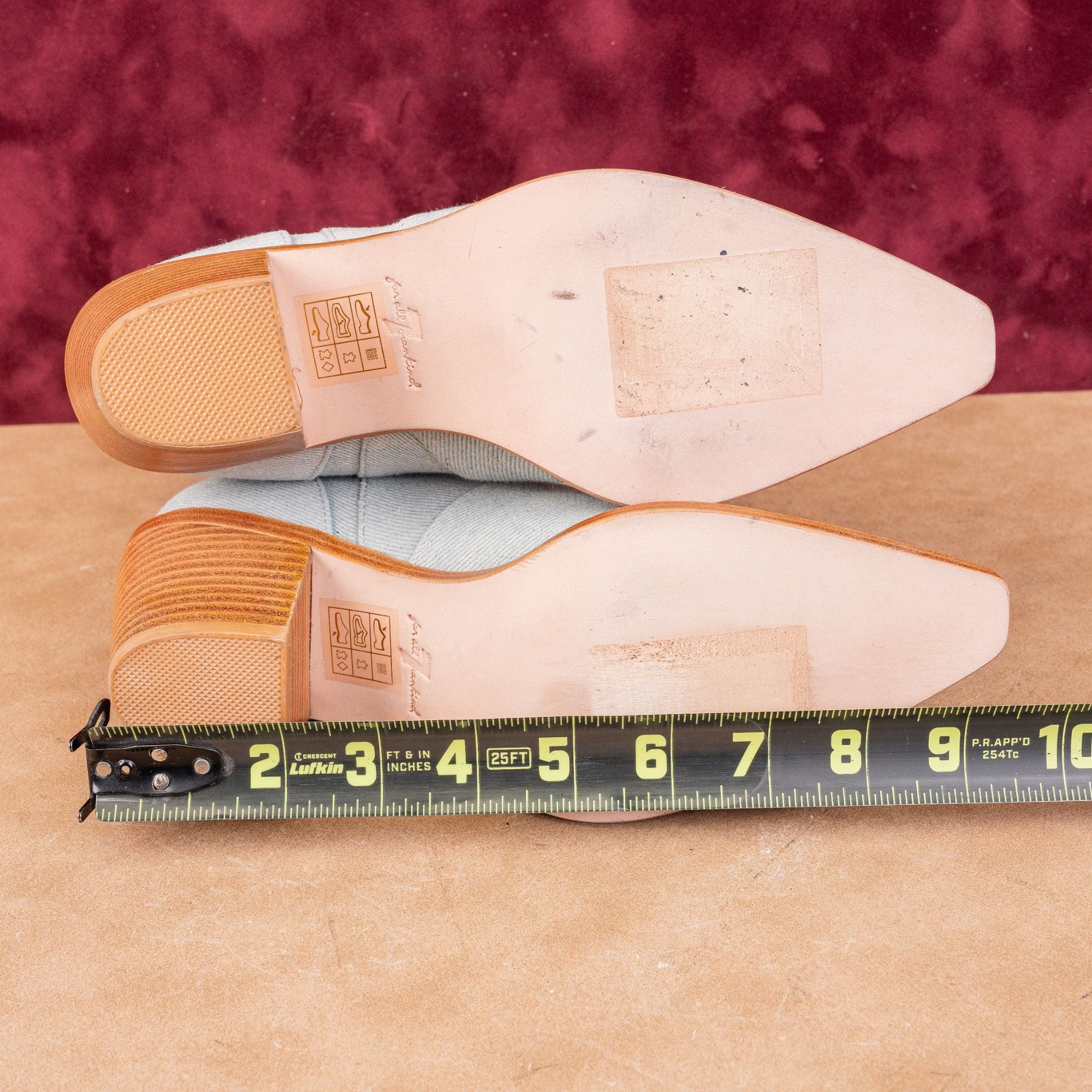 New Condition. No signs of wear on the soles just glue tag residue. Never Worn. Made in Italy. Model # Denim. Retail $199. Fabric Upper, Leather Lining and Leather soles. Slip-on style for easy on and off. Pointed Toe. SKU12048