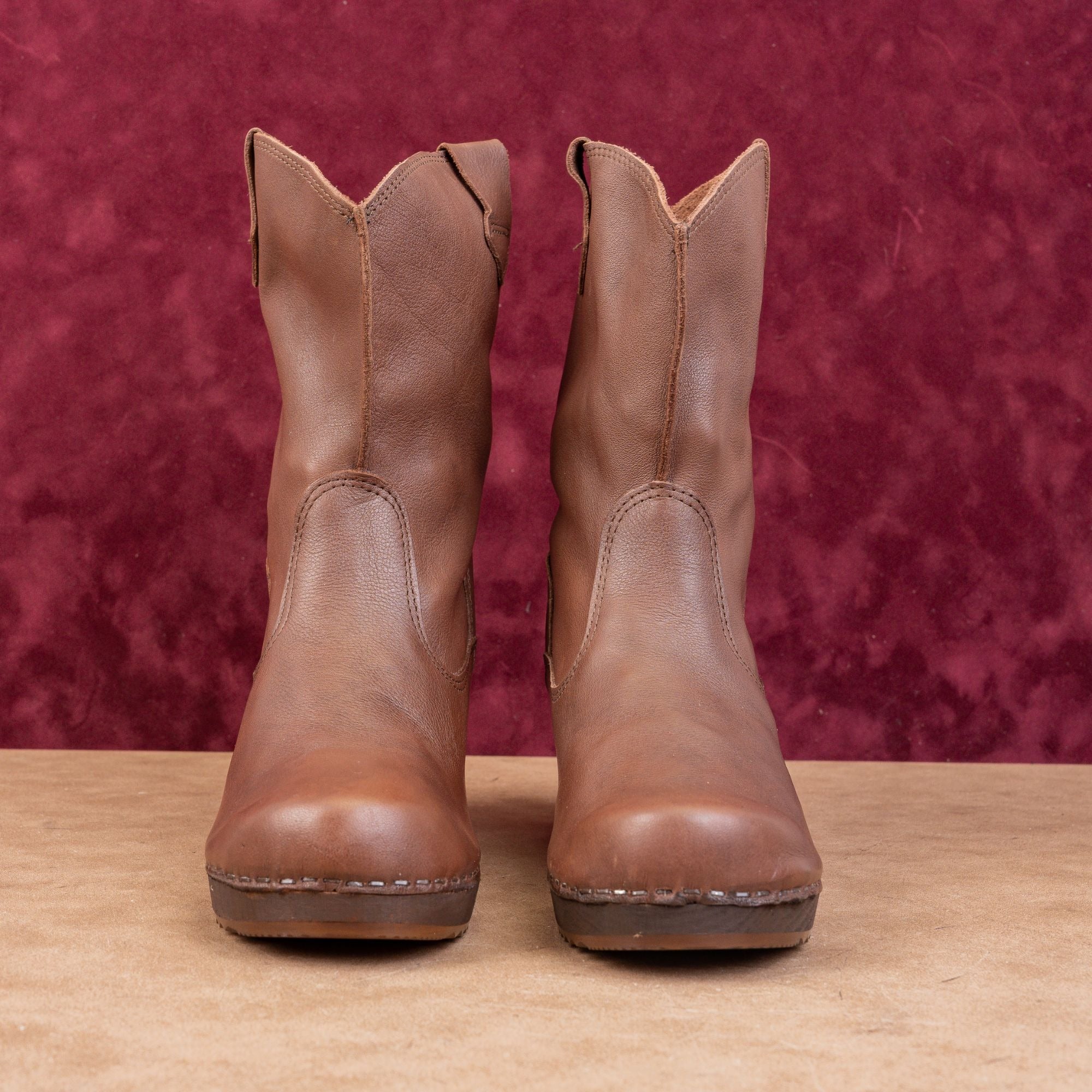 Crafted from premium dark brown leather with a rich, natural grain, the Lottie features a sculptural lime wood midsole and a sturdy block heel.